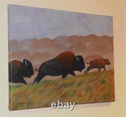 Origin al Acrylic on Canvas. A herd of American Bison race across the prairie amidst clouds of dust. Total Dimensions: 14" x 11".